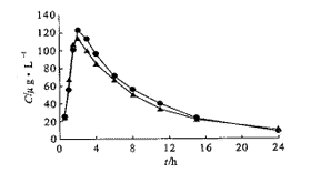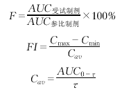 1.5 数据处理与统计分析 血药浓度-时间数据用中国药理学会数学药理专业委员会编制的3P87程序经微机处理,可得药动学参数,用梯形法计算药-时曲线下面积(AUC),单次用药相对生物度(F)和多次用药血药浓度波动系数(FI),计算公式分别为: