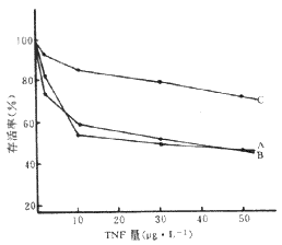 2.5 转染细胞对TNF的敏感性 转染细胞在形态学方面与未转染细胞无明显差异,但其生长速度缓慢。这与其它实验室在异种细胞中所得结果相符,进一步证实了Bcl-2基因并非通常意义上的癌基因。用不同浓度的TNF处理24 h后所得细胞存活计数结果表明,空载转染细胞与对照细胞对TNF的敏感性基本相同,而顺义转染子中增强表达的Bcl-2显著抑制TNF诱发的U937细胞凋亡。见图5。