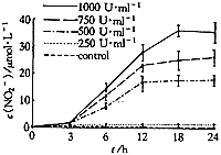 VSMC经不同的γ-IFN作用一定时间后,测定培养液中NO代谢产物NO-2的产量。结果与对照组相比250U.ml-1的γ-IFN对VSMC无诱导作用。VSMC在500~1000U.ml-1的γ-IFN作用下,与对照组相比,6h NO开始升高,且随着时间的延长逐渐增高(P<0.05),NO产量对γ-IFN在500~1000 U.ml-1范围内是浓度依赖的,3~24h内是时间依赖的(图1)。