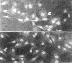 NOS酶蛋白的检测,VSMC在γ-IFN作用12 h,荧光显微镜下可见胞质中发出绿色荧光的iNOS蛋白酶(图3上);未经γ-IFN作用的VSMC胞质中无绿色荧光iNOS酶蛋白(图3下)。