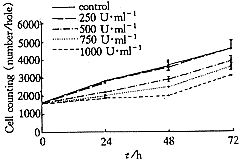 细胞生长曲线:1.5×104 ml-1的VSMC接种于96孔板,每孔100μl。细胞生长至50%汇合,换无FBS的DMEM继续培养24 h,换50g.L-1 FBS的DMEM并加入不同质量浓度的γ-IFN(250、500、750、1000U.ml-1),继续培养24、48、72 h收集细胞(每个时间点4孔),台盼蓝染色后,细胞计数。