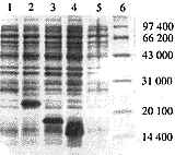 5, control of host strain E.coli pop2136; 6, protein marker.