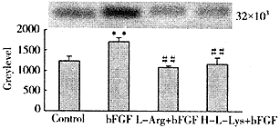 bFGF刺激细胞蛋白磷酸化增强,尤以相对分子质量32×103蛋白32P参入显著增加,较对照组高38.2%(P<0.01);L-Arg(10mmol.L-1)和H-L-Lys(10μmol.L-1)明显抑制bFGF刺激的VSMC蛋白磷酸化程度(P<0.01),结果见图1。