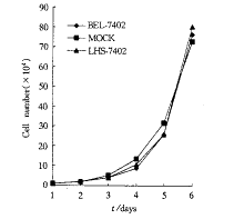 图2为LHS-7402细胞及两组对照细胞的生长曲线。从生长曲线可见转染细胞与对照细胞之间的细胞增殖活性无明显变化(P>0.05,n=12)。
