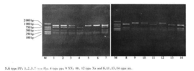 The ditribution of Pvu Ⅱ RFLP was:PP 13,Pp 61,pp 25.The ditribution of Xba Ⅰ RFLP was:XX 7,Xx 48,xx 44.In the combination of two RFLPs,all nine genotypes were detected in our data (Figure 1 and Table 1).