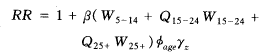 式中:r(x,z,w)为肺癌发病率;r0(x)为未受照射人群的肺癌发病率;RR为暴露量响应函数(the exposure-response function),即在给定累计暴露量照射后人群中经修正的发病率相对值(以本底发病率为1.0),又称相对危险;x,z,w分别为决定本底危险的共变异数(covariates),修正暴露量响应关系的共变异数以及累计暴露量。人们特别感兴趣的是线性相对危险模型,即: