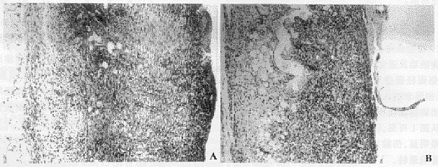 2.光镜观察:伤后3 d,未照射组伤口表面渗出非常明显,渗出物中有大量巨噬细胞和中性粒细胞,形成炎细胞“隔离带”,肉芽组织灶内成纤维细胞增生较活跃(图2A);而伤前2 d及伤后即刻照射组创面渗出物明显较少,尤以白细胞渗出减少为著,并有小灶状出血发生(图2B)。伤后3 d及7 d照射组情况与未照射组基本相同。