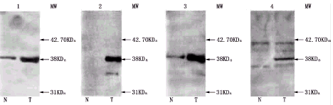 AnnexinI在12例肺癌组织中的表达均明显高于来自同一病人的正常肺组织(图4)。其中1~8为肺鳞癌病人的肺组织,9~12为肺腺癌病人的肺组织,肺癌组织中存在分子量为35KDa(2~4、6、7、9、11)、38KDa(1~12)、40KDa(1、4、5、11)、42KDa(4、5)、44KDa(5、8)48KDa(8)的AnnexinI免疫反应带;正常组织中存在35KDa(3、4、7、9、11)、38KDa的带(1、3~7、9~12)、40KDa(1、4、5)、42KDa(4、5)的免疫反应带,第2和8例中未见表达。
