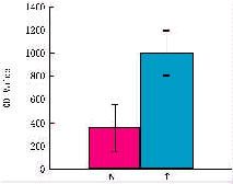 对Western印迹获得的38KDa免疫反应带的光密度进行分析,AnnexinI在8例肺鳞癌组织中表达的光密度与正常肺组织之比为2.9,在4例肺腺癌组织中表达的光密度与正常肺组织之比为2.25,平均为2.7。统计分析表明AnnexinI在肿瘤组织中的表达显著高于正常组织(P<0.01)(图5)。