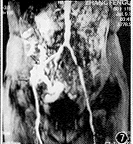 全组中主动脉成像20例,包括主动脉瘤、主动脉夹层等16例(胸和腹主动脉分别为11和5例),其中12例有IADSA或(和)手术对照,诊断符合率100%。3D DCE MRA 同SE和梯度回波(GE),能正确显示动脉瘤瘤体大小、主动脉夹层的真假腔和内膜片,鉴别假腔内附壁血栓或慢血流,主动脉狭窄范围和程度,且3D DCE MRA显示主动脉病变与头臂和肾动脉等主支的关系优于SE和GE,可为手术提供重要信息。但不能直接显示瘤体内的附壁血栓大小、范围、主动脉管壁结构以及其与周边脏器的解剖关系,但MRI的SE或(和)GE技术能弥补其不足。因此从整体效果上3D DCE MRA对主动脉疾患的诊断可与IADSA媲美。同时本法无需动脉插管,属微创技术。