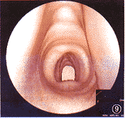 2.病变组:(1) 声门癌5例:1例CTVE显示一侧声带呈弥漫性增厚,4例见声带有结节状肿物,直径1.2~2.0 cm大小;3例肿瘤表面凹凸不平,2例尚光滑,2例伴有前联合增厚 (图1~3)。(2) 声门上癌4例:CTVE显示3例会厌癌的会厌明显增厚,形态不规则,表面凹凸不平,突向喉腔(图4),2例正常会厌前间隙被肿瘤所充填;杓会厌皱襞癌1例,右侧杓会厌皱襞明显增厚,表面不规则。(3) 梨状窝癌4例:CTVE显示患侧梨状窝区软组织肿块,最大径2.5~5.0 cm大小,形态不规则(图5),同侧梨状窝消失,1例同侧假声带呈结节状增厚。(4) 声带息肉2例:1例左侧声带见2个直径为0.3 cm及0.4 cm大小的结节状突起,表面光滑;1例声带息肉从头端观察显示欠佳,足端CTVE清楚显示右声带前1/3处有2.0 cm×1.5 cm大小的肿块,边缘光滑(图6~8)。(5) 声门下区炎性狭窄1例:CTVE显示声门下约1.5 cm处有一轻度环状软组织隆起,边缘光滑(图9),轴面图像上病灶显示不清。(6) 声门癌垂直半喉切除术后复查1例:CTVE显示左声带前1/3部分缺如,边缘光滑。(7) 喉室小囊1例:CTVE头和足端都清楚显示左侧假声带呈局限性内凹,边界光滑清晰。(8) 声带麻痹2例:1例为肺癌纵隔淋巴结转移所致,1例原因不明,CTVE上一侧声带增厚,但无肿块形成。