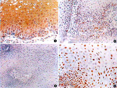 2.方法:(1)PCR检测HPV DNA:寡核苷酸引物,由上海复生生物技术研究所提供,包括扩增HPV6,11型基因的两对引物,扩增HPV16,18型两对引物。DNA制备:取10 μm厚组织切片4~8张,经脱蜡洗涤后在消化裂解液中50℃孵育24~48小时,即得所需样品DNA。PCR反应:50 μl总反应体系在PTC-100PCR扩增仪内扩增,分别设立阴性、阳性对照,扩增后的产物电泳参照阳性对照的泳动位置,确定扩增产物的相对泳动位置及型别。(2)免疫组化ABC法检测:单克隆抗体p53(突变型)、bcl-2、PCNA及HPV16,18E6系美国Santa Cruz公司产品。结果判定:p53、PCNA、E6阳性细胞为胞核出现棕黄色颗粒;bcl-2阳性细胞为胞浆出现棕黄色颗粒,依据阳性细胞数的多少,将阳性分为4个等级。