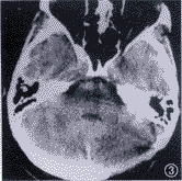 图1 脑CT检查显示,左侧小脑转移灶3 cm×2 cm,转移灶周围脑组织水肿