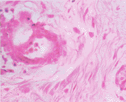 图2 可见大量粘液样组织,有丰富的胶原纤维,血管壁增厚,周围有散在平滑肌细胞包绕。HE×200
