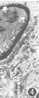 电镜下观察,组织结构破坏,正常细胞形态消失,形成无结构的碎片。坏死与正常组织移行区细胞出现多种超微结构异常,可见细胞核固缩、碎裂、溶解、异染色质边聚等,细胞浆内空泡形成、线粒体肿胀、内质网扩张及脱颗粒等(图3,4)。