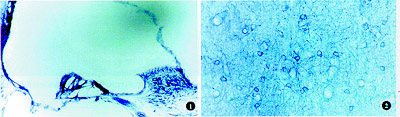 图2小脑阳性对照神经元胞浆呈蓝色阳性染色,由神经元胞体发出的突起清晰可见。NADPH-黄递酶给化染色×100