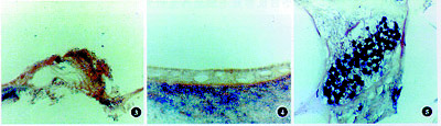 3. Northern印迹杂交:图像分析仪扫描结果显示,实验1、2组和正常对照组的平均吸光度(A)分别为0.2433、0.2460和0.2722,而积分光密度值(IOD)则有差异,分别为1993.0、2189.0和812.2。两实验组间IOD较为接近,与对照组有较大差异。