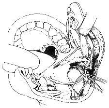 于口内将舌拉向对侧,自两颌下腺管开口间向后切开同侧口底粘膜,切断舌神经至颌下腺的节后纤维,保留舌神经(必要时可予切断),继续向后切开口底粘膜至舌腭弓。于颈部自后向前切开下颌舌骨肌至前中线,再自舌骨沿舌骨舌肌表面向上分离至与口底粘膜切口相通。将下颌拉向外侧,即能显露咽旁间隙及其内容。自茎突附着处切断茎突舌骨韧带、茎突舌骨肌及茎突咽肌,茎突过长时可予切除。分离血管神经至颅底孔,找出翼外肌沿其翼外板起端切断,即能充分显露咽旁上区及颞下窝肿瘤。如果病变位于颅底中区(如鼻咽及鼻腔后部),口内切口可向上延长至上颌粗隆而后转向硬腭,沿龈缘内1 cm 处切开硬腭粘骨膜至对侧形成一以腭大动脉和神经为蒂的腭粘骨膜瓣,翻向对侧,咬除硬腭后部骨质,显露鼻腔后部及鼻咽部,充分显露病变,予以彻底切除。