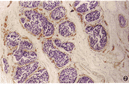 图2 棕色线性基底膜抗原间断地大部分包绕癌巢.而在小脉管的周国有完整连续的表达.SP法×132