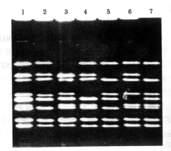 1:扩增带大小标志(PBR322HinfI);2:正常对照;3~7:DMD/BMD基因内缺失图1 第1组引物mPCR扩增DNA分析