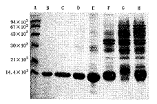 2.试剂: 丙烯酰胺,N,N′-甲叉双丙烯酰胺,四甲基乙二胺(TEMED)为Boehringer Mannheim 公司产品。十二烷基硫酸钠(SDS)为德国Serva公司产品。胰蛋白胨(Tryptone) 及酵母提取物(Yeast extract) 为英国OXOID公司产品。蛋白质相对分子质量标准: 94×103, 67×103, 43×103, 30×103, 21×103,14.4×103