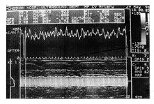 4. CVIQ流量测定: 选用HP 8500 GP彩色超声仪, 具CVIQ软件, 线阵探头(二维频率7.5 MHz, 彩色频率5.5 MHz)。 超声探头置于近心端动脉插管的近心端, 经皮肤探测颈总动脉, 手持探头。