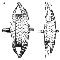 图1 Amplatzer ASD封堵器示意。 左图A, 封堵器结构示意图,由右侧的左房伞,左侧的右房伞及中间的腰部组成。 右图B, 封堵关闭ASD状态时示意图