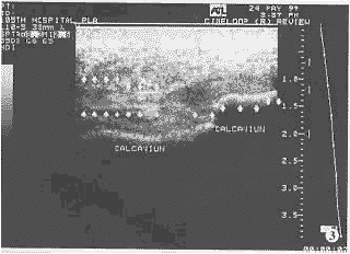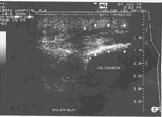 图4 跟骨跖侧矢状面扫描,跖腱膜的跟骨跖侧附着部明显增厚,在增厚的跖腱膜内有一7.6 mm×4.9 mm的团块状强回声团,其周围为低回声区,提示跖腱膜内有纤维化,跖腱膜内及其周围的脂肪组织内有水肿或炎性渗出