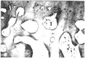 2.2 光镜检查:和对照组相比,模型组骨小梁间距增宽,部分动物骨小梁连续性尚好,但变纤细,部分断裂,空骨陷窝增多,成骨细胞少,血管数量减少,部分血管内有网状纤维充填,骨髓腔内有广泛新出血区,骨髓造血细胞少,代以较多脂肪细胞,见图1,2。表1显示了两组间平均空骨陷窝率的差异。从表可见,模型组的空骨陷窝率明显高于对照组。说明模型组的骨细胞坏死明显。