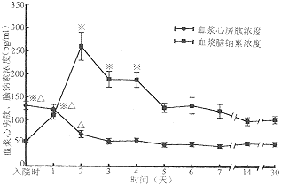 附图 急性心肌梗塞患者血浆心房肽、脑钠素浓度变化 ※:此点血浆心房肽浓度显著高于其他各时间点(P<0.01);此点血浆脑钠素浓度显著高于其他各时间点(P<0.001) △:血浆心房肽浓度显著高于正常对照组(35.6±4.6 pg/ml)(P<0.01)。全部时间的血浆脑钠素浓度均高于正常对照组(11.7±2.3 pg/ml)(P<0.05)