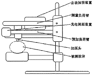 该仪器的基本结构见附图。由测量负荷臂、预加负荷臂、光电距离测定装置、预加负荷预置砝码、测量负荷预置砝码、自动加荷系统及计算机控制系统组成。测量负荷臂的加压头由尼龙塑料制成,加压接触面为圆形,面积0.5 cm2。光电距离测定装置的测量精度为0 .1 mm,量程20mm,经计算机A/D模数转换为数字信号,采样频率500 Hz。预加负荷 预置砝码25 g到300 g,分辨精度5g。测量负荷预置砝码是50 g。测量过程是,首先加载预 加负 荷5~20s后,自动加荷系统通过控制测量负荷臂的自动升降完成一个测量动作周期,其周 期 为 1.0s,分以下动作时相:测量负荷臂的加压头接触皮肤0.1 s;自动加荷系统加载测量 负荷并保持0.8s;卸载测量负荷0.1 s。在加载的同时,光电距离测定装置测定测量负荷加载后,加压头下降的距离。为了提高精度,计算机控制系统连续重复五次测量周期,并自动计算平均值。所有对象的测量点均在右上肢前臂屈肌群中央,即前臂腹侧中央上1/3处。预加负荷分5、10、20、30、40、50、55kPa共七个档次进行测量。硬度的单位是弹性模量,即单位变形(单位:mm)下的压强(单位:kPa)。