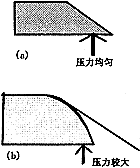 4.3.5 边缘斜度:采用斜度不同的边缘对疤痕压迫的效果不同(图3)。斜度小的边缘处压力最大(图3a),适用于放置压力衣开口处,因为在该处压力衣产生的压力较弱,衣、垫有互补作用。边缘斜度大的垫下压力是均匀的,由于边缘处压力衣接触不到皮肤,避免了正常皮肤组织受压(图3b)。