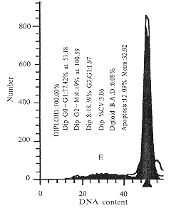 取培养细胞(每检测样本设复孔),用PBS(pH7.2~7.4)洗1次,用70%乙醇固定30 min, 然后用PBS洗2次,弃上清,保留约50 μL,加入50 μL RNAase(5 mg/mL)重悬沉淀细胞。再 加入0.5 mL碘化丙啶(PBS配成50 μg/mL), 4℃放置30 min后上机测定。凋亡细胞的检测采 用流 式细胞技术。流式细胞仪为B-D公司FACSCalibur。在前散射和侧散射的二维Dot-plot图中, 选定分析细胞主群,对DNA含量进行分析G0/G1期主峰前的DNA为凋亡细胞的DNA含量,结 果用%表示。分析系统采用Modfit LT DNA处理软件。