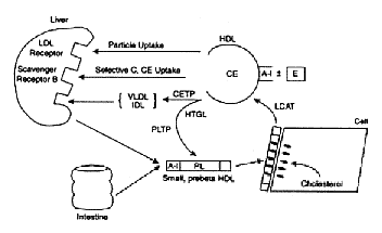 Fig.2 Reverse cholesterol transport. Nascent (small, pre-beta) high-density lipoprotein (HDL) is synthesized in liver or intestine and secreted into blood. Cholesterol from extrahepatic class is removed from the cell membrane by pre-beta HDL cholesterol is then esterified by lecithin-cholesterol acyltransferase(LCAT)and its cofactor, apoAI, using αfatty acid from the phospholipid(PL)lecithin.As more cholesterol esters are formed, HDL is converted into a large, spherical,mature particle. The cholesteryl ester (CE) in the core of HDL can then e transferred by cholesteryl ester transfer protein (CETP) to the triglyceride-rich lipoprotein, such a ver low-density lipoprotein (VLDL) and intermediate-density lipoprotein (IDL), for uptake by the low-density lipoprotein(LDL)receptor on liver. As the DE is removed from HDL, the particle can be converted back to pre-beta HDL through the action of hepatic triglyceride lipase (HTGL) and phospholipid transfer protein (PLTP). If CETP activity is low, apoE-enriched HDL may be removed by the LDL receptor in liver. Lastly, the HDL receptor(scavenger receptor B)can selectively bind apoAI on HDL, and CE is transferred from the core of HDL to inside the liver cell. The CE-poor HDL is released back into the circulation[4].