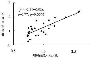 将冠脉狭窄前后LAD和LCX支配的心肌区域AUC在罂粟碱介入前后的相对变化率(给药后/给药前)与用电磁流量计所测的冠脉血流量(给药后/给药前)即冠脉血流储备作相关分析,结果显示,两者相关性良好,r=0.77,P=0.0002(图2)。