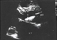 中国超声医学杂志990236 患者男性41岁,3岁时发现心脏杂音,未行详细检查,1994年确诊为先心病室间隔缺损。此次因胸闷、气喘不能平卧入院,体检:T39℃,慢性病容,眼睑浮肿,口唇发绀,颈静脉充盈,心界扩大,心率104次,胸骨左缘3~4肋间闻Ⅲ~Ⅳ收缩期杂音,肝大剑下4横指,右肋下三横指。彩色多普勒超声检查所见:左房、左室内径增大,室间隔连续中断约2cm在大动脉短轴切面中断位于9~10点处,主动脉无冠瓣见直径2.5cm的赘生物,舒张期返入左室流出道内(图1);三尖瓣隔瓣上见直径2.2cm的赘生物于收缩期返入右房内(图2);肺动脉后瓣上见直径0.7cm的赘生物于舒张期返入右室流出道内(图3),彩色多普勒示收缩期以蓝色为主的过三尖瓣返流。舒张期以红色为主的过肺动脉瓣返流入右室流出道。超声诊断为:先心病室间隔缺损伴多瓣膜赘生物。