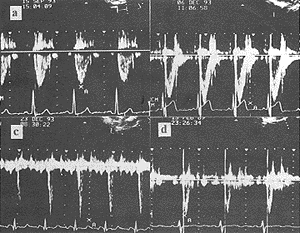 本文采用经胸超声心动图研究33例先天性心脏病患者肺动脉血流频谱,并与右心导管测肺动脉压进行对照分析,结果表明:当肺动脉血流频谱呈细条型(即正向血流窄、小,峰值极度前移),可做为半定量判断PAPs>100mmHg的客观指标。