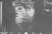 直肠腺瘤:本组14例。声像图显示粘膜至粘膜下层间一实质性低回声区,回声尚均匀,边缘规则,测值最大者为38mm×24mm,最小者为10mm×10mm。