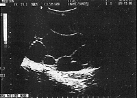 患者女,42岁。腹部包块4年伴胀痛一月余来诊。妇检:腹部膨隆如孕5+月大小,压痛明显,边界清,表面光滑,活动度差,叩之呈浊音,因肿块较大无法触及子宫附件。B超检查:于中下腹可探及约126mm×96mm的无回声区。壁规整,内被多个强光带分隔成大小不等的暗区(图1)。子宫附件显示不清,B超提示:盆腔巨大囊性占位:卵巢囊肿(粘液性囊腺瘤?)。剖腹探查术中见子宫如孕5+月大小质稍软,表面光滑,透亮,活动度差。左侧附件与子宫粘连。切除次全子宫及左侧附件。病检结果:子宫包囊虫病。