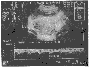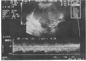 所用仪器为Dornier AI 5200S彩色多普勒超声显像仪,经腹部或经阴道扫查。探头频率分别为3.5和6.5MHz。经腹部扫查,常规使用膀胱 充盈法。经阴道扫查,检查前排空膀胱,采用膀胱截石位,常规阴道扫查。观察子宫、附件 、阴道及包块图像特征。观察包块与子宫之关系。观察包块周边及内部血流情况。在瘤体内 部血流束显示良好处用脉冲多普勒取样,取样容积1~2mm,血流声束夹角<60°,获取连续 5个形态一致的多普勒频谱后,勾划包络线,自动测量出收缩期峰值血流速度(Vmax),舒张 期最低血流速度(Vmin),平均血流速度(Vmean),阻力指数(RI),搏动指数(PI)等参数值。结 果