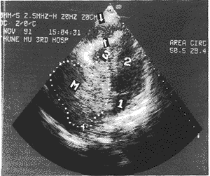 1、左房;2、左室;3、右室;M:为血栓肿块,箭头所指为心包腔低回声结 核肉芽组织,脏壁层心包增厚凹凸不平