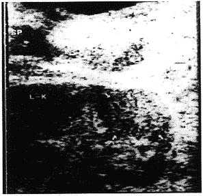 肾嗜酸细胞腺瘤的声像图主要表现为均质、边界清楚的实性回声,以等回声多见,Goiney 〔6〕报道14例几乎都是等回声,Tikkakoski报道22例低回声、等回声、中强回声各占3 2%、36%、32%。均匀者占59~86%不等,稍不均者主要为中心少量坏死所致,少数可见钙化 。 本组等回声、中强回声各1例,非常均质边清,符合上述发现。文献中约6.7~25%瘤中心可 见星形强回声〔8〕或星形低回声带(由星形强回声分隔而成),与大体病理所见白色 星形瘢痕对应,多数学者认为这种星形结构是肾Oncocytoma的特征性改变,虽然偶尔肾癌中 也可见到,但一旦有此特异性发现,要考虑到肾嗜酸细胞腺瘤的可能。超声引导下细针穿刺 抽吸细胞学或组织学检查对术前确诊非常重要,Tikkadoski等对6例进行穿刺均获得细胞学 病理诊断,帮助了术前手术方式的确定,而且该检查安全、简便、易行,怀疑者应及时进行 此项检查,避免不必要的根治手术。