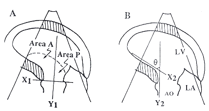 图A中,X1代表主动脉瓣口水平,Y1代表主动脉瓣口的中轴线,垂直于X1。Area A代表中轴线Y1前方的彩色血流面积(沿彩色血流的边沿手动包络测量),Area P代表中轴线Y1后方的彩色血流面积。