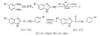 通过多年实验确认,苯并咪唑杂环是H+/K+-ATP酶抑制剂的必要结构,另一侧结构多为吡啶环,从保持化合物的脂溶性,化合物分子大小等因素考虑,作者用对硝基氯苄、对氯氯苄与5-甲氧基-2-巯基苯并咪唑、2-巯基苯并咪唑反应合成新化合物,合成路线见图1.
