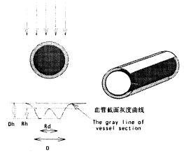 (3)动脉血管中轴反光现象:系统中轴反光现象的参数是动脉中轴反光带宽比(Rd/D)和动脉中轴反光强度比(Rh/Dh),参数定义在血管截面灰度曲线上,如图2所示。