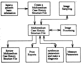 3.2.2 软件模块结构 系统的功能模块以该多媒体病历结构为对象来组织,如图4所示。包括病人基本信息输入模块、多媒体病历创建模块、病人图像采集模块、图像处理模块、参数测量模块、综合分析模块、打印模块、病历检索与查看模块等。