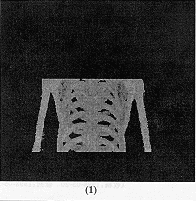 (1)由人体胸腔CT图像序列中提取出的120×220×170的骨骼数据集三维重建图,非透明度取值为0.8;