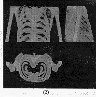 (2)由人体胸腔CT图像序列中提取出的120×220×170的骨骼数据集三维重建三视图,非透明度取值为0.5;