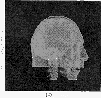 (4)由人体头部CT图像序列中提取出的120×220×180的骨骼数据集及120×220×140的头部外层软组织数据集合成而得的多组织混合数据集的三维重建图,骨骼非透明度取值为0.5,外层软组织非透明度取值为0.2。