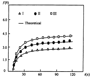 33.0 ℃组(Ⅰ)、36.5 ℃组(Ⅱ)、39.5 ℃组(Ⅲ)的F-t关系,均可用双曲线函数关系式(1)进行曲线拟合。图1是各组单根拟合曲线,有良好的拟合性。